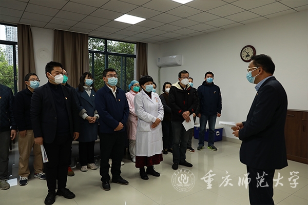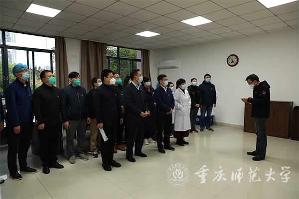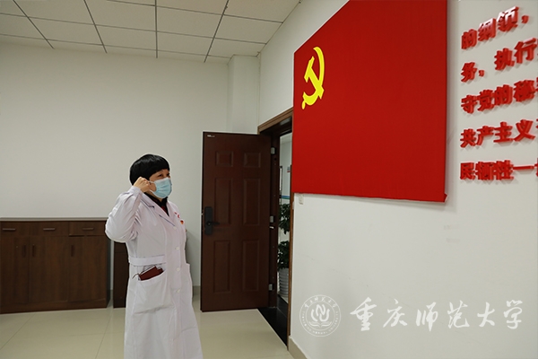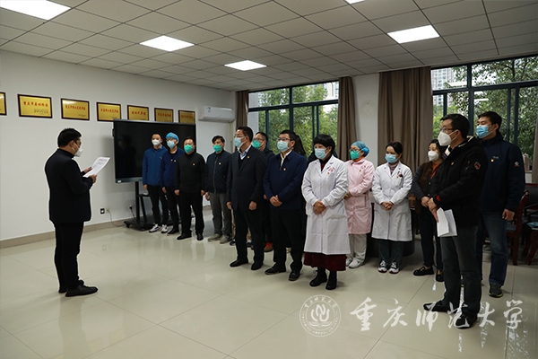 最后,校党委副书记陈志军作了讲话。他表示,尹伟欣同志工作积极主动,思想政治素质好,能够全心全意为广大师生服务。特别是学校发生新冠肺炎疫情以来,以实际行动证明了向党组织靠拢的决心,勇于担当、无私奉献,不怕牺牲、冲锋在前,不分白天黑夜,一心扑在工作岗位上,带领全院医护人员,为保障全校师生的生命安全和学校抗疫工作的顺利开展作出了突出贡献,全体师生党员要向她学习。他希望,尹伟欣同志牢记铮铮誓言,继续发扬优良作风,向身边优秀党员看齐,以更加严格的标准要求自己,坚持用习近平新时代中国特色社会主义思想武装头脑、指导实践、推动工作,在今后的工作生活中更加充分发挥党员先锋模范作用,用行动为党徽“增色”、为党旗“添彩”。他指出,学校疫情发生以来,机关党委后勤与资产管理处党支部第一时间响应学校党委号召,坚决落实学校疫情防控各项部署,充分发挥党支部的战斗堡垒作用,为打赢学校疫情防控歼灭战提供了有力后勤保障。接下来,党支部要加强对尹伟欣同志的教育和考察,持续凝聚党员力量,再接再厉,再立新功。他强调,当前,面临严峻复杂的疫情防控形势,学校领导高度重视,深入一线,靠前指挥,全面准确贯彻落实上级决策部署,坚持“外防输入、内防反弹”总策略和“动态清零”总方针不动摇,切实保障好广大师生的生命健康安全,凝心聚力共同筑牢疫情防控网。校内 300余人党员干部和教职员工组成抗疫志愿队,时刻坚守在校园疫情防控一线;校外360余名党员教职工属地下沉,奋战在社区防控一线,积极作出重师贡献。我们坚信,在上级和学校党委的坚强领导下,党员干部关键时刻“站得出”,师生员工危难关头“豁得出”,就一定能打赢这场疫情歼灭战,让我们的校园早日恢复往常的烟火气、恢复往常的读书声、恢复往常的勃勃生机!
