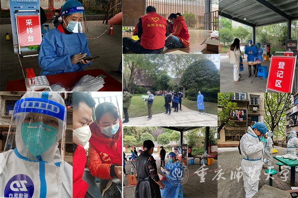 梁人义主动投身属地南岸区铜元局街道梨支园社区疫情防控,多次担任志愿登记员、采样员、搬运工,他时刻用朝气蓬勃的热情感染着周围的同事,同志愿者们一起把青春力量拧成一股绳,为辖区居民筑牢抗疫屏障。地理与旅游学院中共预备党员姚雨婷同学主动参与属地兰州疾控中心组织的培训,协助当地的核酸检测工作;“战衣”上身,一穿就是9小时,她用自己实际行动践行入党初心,努力做到“关键时刻站得出来、危急关头豁得出去”的优良作风。文学院党员黄巧丽同学在实习学校——重庆市育才中学校化身“大白”,同医护人员一起奋战在疫情阻击战的第一线。